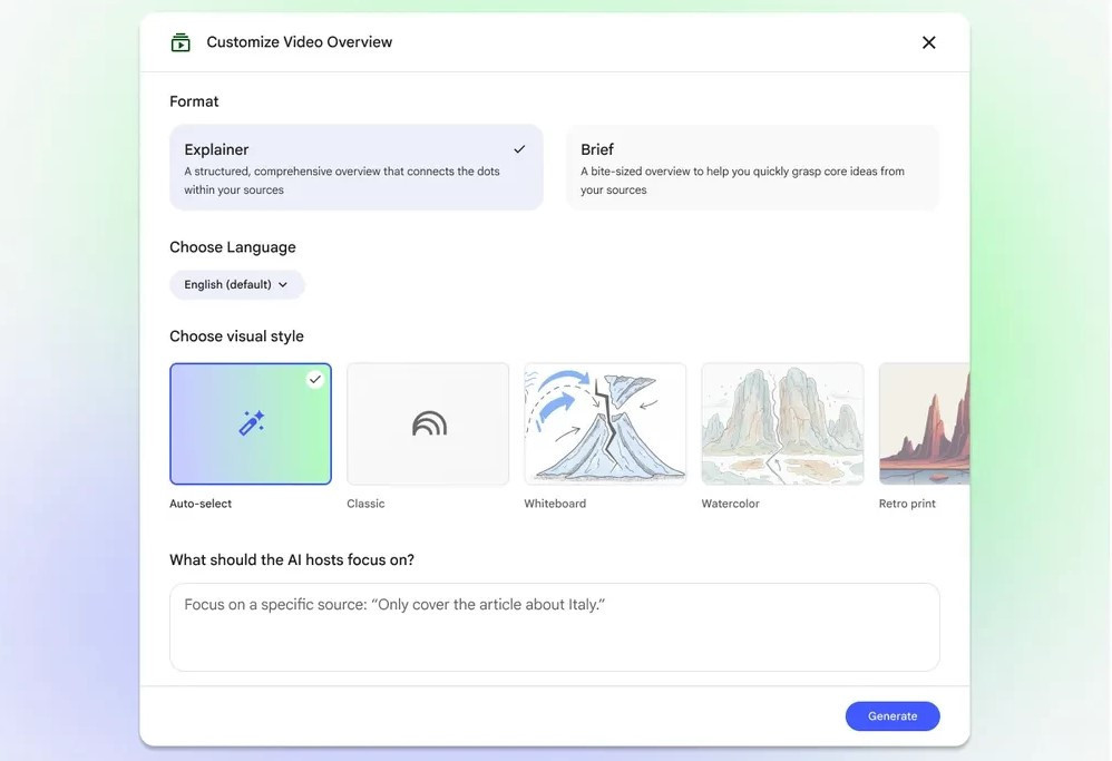 Just like the “Audio Overviews” feature, Video Overviews now comes with brand-new formats designed to make AI-generated summaries more dynamic and informative. Users can now choose between two distinct modes: